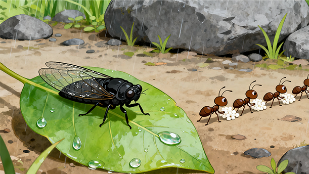 蝉使劲地点了点头,说:“我记住了,以后我一定会像你们一样勤劳,早早为未来做好打算。”从那以后,蝉像是变了一个样,夏天不再只忙着唱歌,而是也会收集一些食物,为过冬做准备。