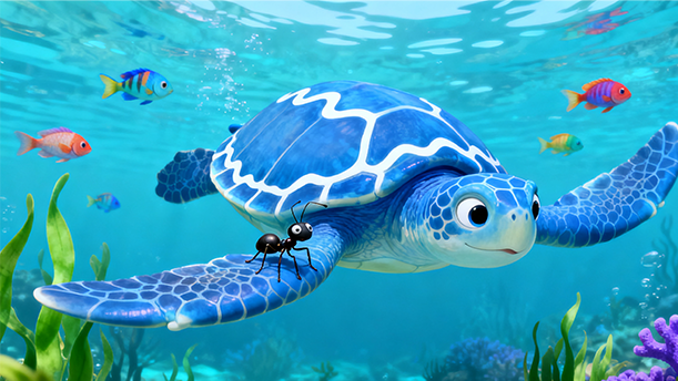 于是,蚂蚁们继续留在海边,观看海龟的表演,感受着大自然的神奇和伟大。它们明白了,每个生物都有自己独特的本领和价值,应该相互尊重和学习,而不是盲目自大和否定。
