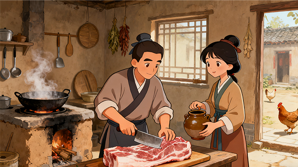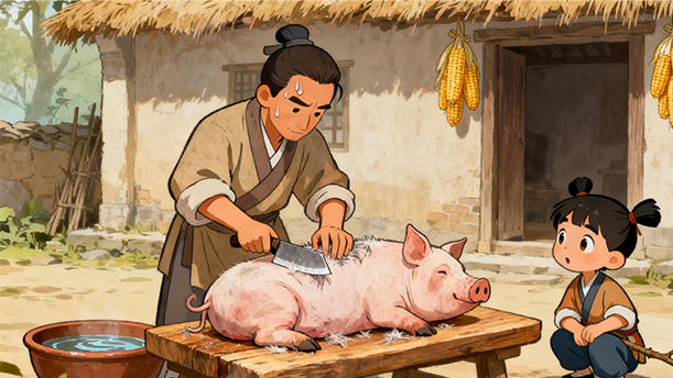 曾子的妻子从集市回来时,还没跨进家门就听见院子里捉猪的声音。她进门一看,原来是曾子正准备杀猪给儿子做好吃的。她急忙上前拦住丈夫,说道:“家里只养了这几头猪,都是逢年过节时才杀的。你怎么拿我哄孩子的话当真呢?”