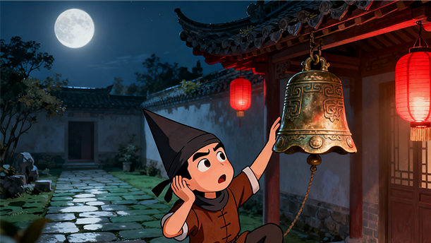 他突然想出了一个办法。他认为,门铃一响,耳朵就会听见,如果把自己的耳朵掩住,不是就听不见了么?于是,他决定采用这个方法去偷铃铛。有一天晚上,他借着月光,蹑手蹑脚地来到这家大门前。他伸手向上摘铃铛,但是,门铃挂得太高了,怎么也够不着,他只好扫兴地回来了。