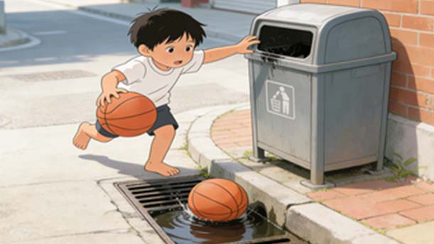 马路上跑来小秋秋,边走边跳边拍球,球儿碰着果皮箱,骨碌碌--滚进污水沟。