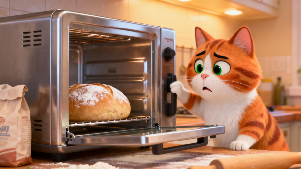 “拉开门儿瞧,还是生面包”语速稍慢,体现出小猫的疑惑。“小猫傻了眼,忘记插插销”可以用稍带调侃的语气,表现出小猫的小迷糊。在整体朗诵过程中,要模仿小猫的语气和状态,让听众仿佛看到那只围着烤面包团团转的小花猫。