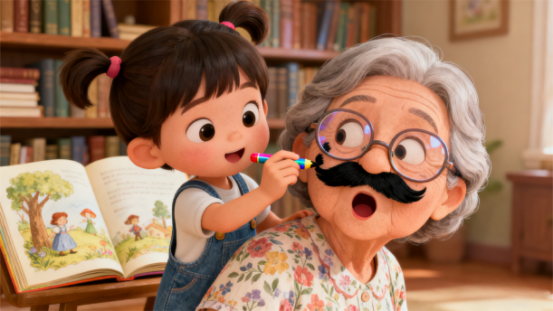 你瞧他那小模样,眼睛滴溜溜地转,小手拿着笔就开干。一会儿在那页上给奶奶添上滑稽小胡子,好似奶奶成了马戏团小丑般逗趣;