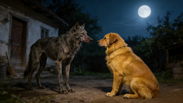 一条饥饿的瘦狼在月光下四处寻食,遇到了喂养得壮实的家狗。他们相互问候后,狼说:“朋友,你怎么这般肥壮,吃了些什么好东西啊?我现在日夜为生计奔波,苦苦地煎熬着。”