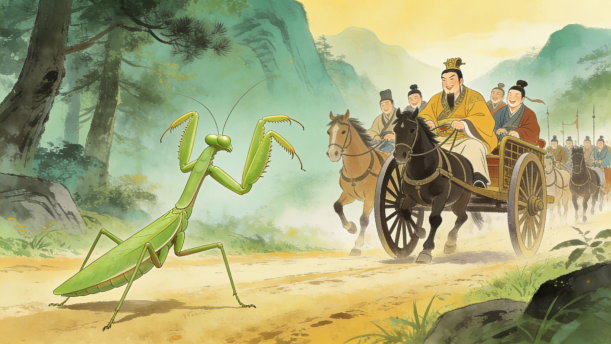 有一次,齐庄公带着几十名随从进山打猎。一路上,齐庄公兴致勃勃,与随从们谈笑风生,驾车驭马,好不轻松愉快。忽然,前面不远的车道上,有一个绿色的小东西,近前一看,原来是一只绿色的小昆虫。那小昆虫正奋力高举起它的两只前臂,怒气冲冲地挺直了身子直逼马车轮子,一副要与车轮搏斗的架势。