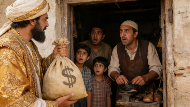 据传说,过去在巴格达住着一个百万富翁,他的邻居却是一贫如洗的鞋匠。鞋匠家里,妻儿父母,老老少少,都要由他来赡养。