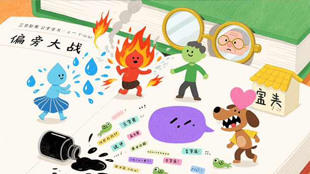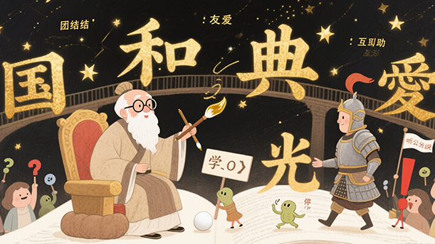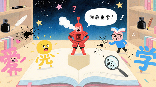 《字典公公家里的争吵》是一篇趣味盎然的小诗。这首小诗突出的特色是每个标点符号形象都十分鲜明,在朗诵时,我们要用语言表现出不同形象的差异。例如,从第三小节感叹号的发言中我们知道,它自信满满,所以朗诵时要昂首挺胸,语气强硬。第四小节中小问号很不服气,所以这部分要带着质问的语气。