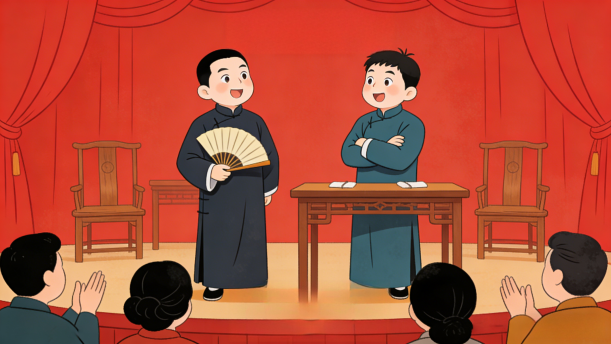 背景提示:单口相声、对口相声、群口相声的表演形式。