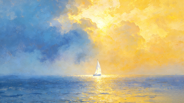 有一片孤帆儿在闪耀着白光......