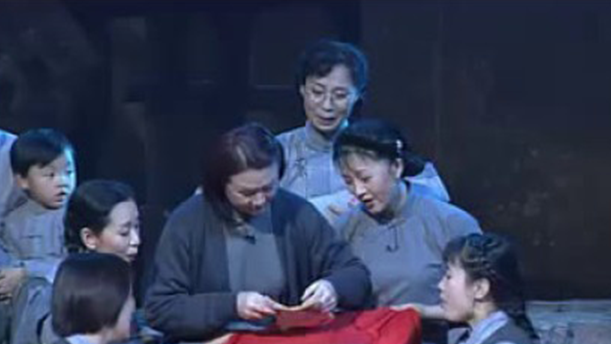 “江姐!”孙明霞双手捧起叠好的旗帜,带着无限的喜悦,走到缓缓地搓着线的江姐面前。“同志们希望你来宣布胜利的到临,也请你揭开这象征黎明和解放的战旗。”