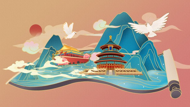白鸽飞翔,红旗招展,和煦的阳光倾洒人间