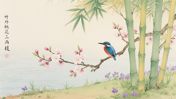 开篇“竹外桃花三两枝”,以极简的笔触勾勒早春远景。“竹外”二字先设定了画面的层次感——竹林作为前景隐约掩映,而“桃花三两枝”则是透过竹林望见的远景,数量上的“三两枝”精准捕捉了早春的特质:不是盛放的绚烂,而是初绽的稀疏,带着几分含蓄的生机。“桃花”的粉嫩与“竹林”的青翠形成色彩对比,无需过多铺陈,一幅清雅的早春远景图便在眼前铺开,读来如远眺般悠然,暗含诗人对早春细微之美的珍视。
