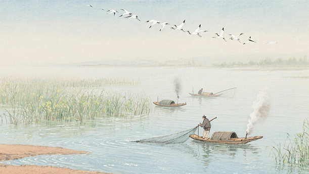 结尾“正是河豚欲上时”,是诗人基于眼前春景的合理想象,也是全诗的点睛之笔。画中未必有河豚,但诗人见萎蒿、芦芽这些与河豚搭配的食材已生长,便自然联想到“河豚欲上”——早春时节,河豚正从深海洄游至江河产卵,恰是食用的佳季。这一句将画面之外的时令特点、生活习俗融入诗中,让春景不再局限于视觉所见,更关联起味觉与生活记忆,既丰富了诗的内涵,又让早春的生机多了几分烟火气,展现出诗人对生活细节的敏锐捕捉。