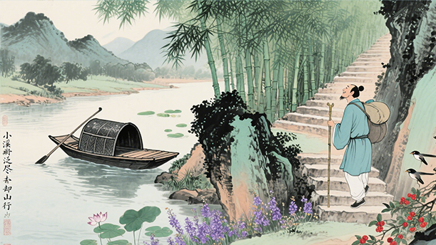 作为南宋“江西诗派”的重要诗人,曾几的诗歌常以“清新活泼”见长,《三衢道中》便是典型。全诗没有复杂的典故与雕琢的辞藻,只以“纪行”为线,将天气、行程、景致、声响自然串联,却做到了“景中有情、情随景生”——晴日带来畅快,山行带来自在,绿阴带来舒适,黄鹂带来惊喜,每一处景致都对应着一份细微的愉悦,最终汇聚成“轻松愉快”的整体心境。这种“以小见大、以景传情”的写法,让读者仿佛能跟随诗人的脚步,一同泛舟小溪、穿行绿阴、聆听黄鹂,在字里行间感受三衢山道的宁静生机,也体会那份抛开烦忧、沉浸自然的纯粹快乐。