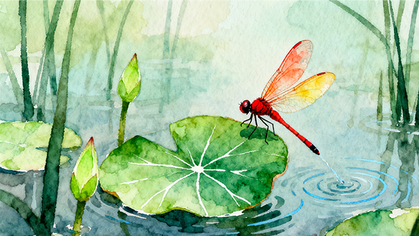结尾“早有蜻蜓立上头”,以动态的“蜻蜓”为静态的“小荷”点睛,让整个画面瞬间鲜活起来。“早有”二字极妙,写出蜻蜓与小荷的“默契”——不等荷叶舒展,蜻蜓便早早落在尖尖的荷叶上,仿佛它比人更早发现这份新生的美好;“立上头”则是灵动的动态描写:蜻蜓轻盈地停驻,翅膀或许还在微微颤动,这份“静中的动”,让小池的景致从“静态的画”变成“动态的景”,既充满童趣,又透着自然生灵间的和谐。这一句没有写复杂的场景,却以“小荷”与“蜻蜓”的互动,将初夏小池的“妙趣”推向极致,读来如见眼前景,如闻身边风。