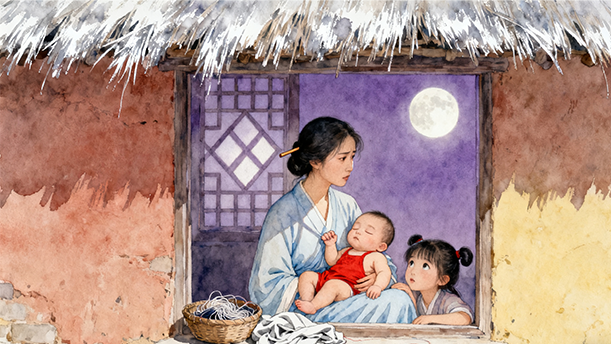 开篇“更深月色半人家,北斗阑干南斗斜”,以极简的笔触勾勒深夜月色与星象,瞬间奠定静谧清冷的基调。“更深”点明时间——夜已深沉,多数人已入眠,天地间只剩寂静;“月色半人家”描摹月色的形态——皎洁的月光并未铺满所有房屋,只照亮半边庭院、半面墙垣,这种“半明半暗”的光影,既写出月光的柔和与含蓄,也让深夜多了几分朦胧的静谧,仿佛能看见月光下房屋的明暗轮廓,听见夜风吹过的细微声响。“北斗阑干南斗斜”则将视角从地面转向夜空——北斗星与南斗星已倾斜交错,不再是夜空中的正位,既暗示夜已过半,也以星象的“静”呼应地面的“寂”,天地间仿佛只剩星月与寂静相伴。朗诵时需咬字轻巧、语气平缓,“半人家”的“半”字可稍作轻读,传递月色的朦胧感;“阑干”“斜”二字语调沉缓,模拟星象西斜的缓慢动态,让深夜的静谧感在声音中缓缓弥漫。
