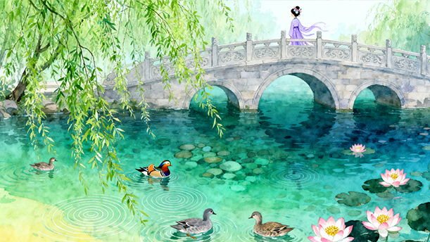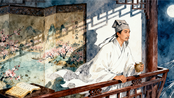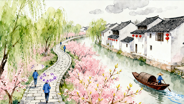 白居易的《忆江南(其一)》是唐代咏叹江南的千古绝唱,短短二十七字,以“忆”为魂,将对江南的盛赞、对美景的描摹与对故地的怅惘熔于一炉。全词不事雕琢却字字含情,从“江南好”的直白定论,到“红胜火”“绿如蓝”的鲜明着色,再到“能不忆江南”的反问抒怀,层层递进间,既写活了江南春日的明艳,更道尽了诗人对江南深入骨髓的眷恋,成为跨越千年仍能唤起人们对江南向往的经典词作。 开篇“江南好,风景旧曾谙”,以斩钉截铁的定论起笔,瞬间奠定全词“盛赞江南”的基调。“江南好”三字直白短促,没有铺垫却掷地有声,是诗人历经岁月沉淀后,对江南美景最凝练的肯定——这份“好”不是一时兴起的赞叹,而是刻在记忆里的深刻认知;“风景旧曾谙”则为“好”提供注解,“旧曾谙”即“过去早已熟悉”,既点明诗人曾亲历江南美景,让“盛赞”有了真实的情感根基,也暗含“如今已远离”的微妙伏笔,为后文的“忆”埋下引线。朗诵时语气需坚定有力,“江南好”的“好”字可稍作重读,传递出不容置疑的肯定;“旧曾谙”的“旧”字略带绵长,藏着对过往岁月的追忆,让开篇的盛赞既干脆又不失厚重。
