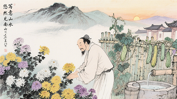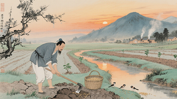在朗诵过程中,对于“种豆南山下”一句,“种豆”二字可适当拖长,展现出诗人选择归隐后开始从事农事的起始状态;“南山下”则稍作停顿后平稳说出,描绘出地点环境,让听众仿佛看到诗人于南山脚下开启劳作的画面。“草盛豆苗稀”里,“草盛”强调杂草的繁茂,“豆苗稀”则略带无奈与感慨,语速稍缓,将诗人面对杂草多而豆苗少的状况时那种既悠然又有些许无奈的心境表现出来。