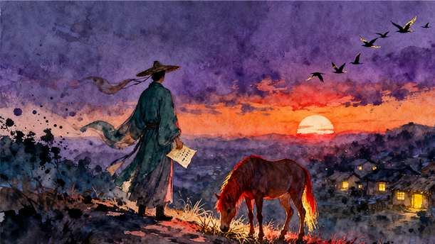 即便今日读来,无论我们是为了生计奔波异乡,还是为了理想远走他乡,只要在黄昏时分看见“夕阳西下”,想起“枯藤老树昏鸦”,依然会被那份“断肠人在天涯”的孤寂击中。这便是《天净沙·秋思》的魅力:它以最简洁的意象、最直白的情感,写尽了人类共通的“漂泊之苦”与“思乡之情”,让每一个游子在曲中,都能找到自己的影子,也找到对“归处”最深的渴望。