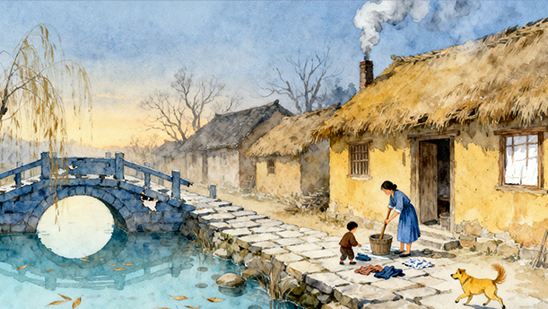 “小桥流水人家”,笔锋陡转,从“衰颓之景”切换到“生机之景”,却在“美好”中藏着更深的悲凉。“小桥”“流水”“人家”是江南水乡常见的温馨画面——潺潺流水绕过小桥,桥边有炊烟袅袅的农家,透着和平、安详的生活气息,这是世人向往的“安稳归宿”。但这份“美好”对游子而言,却成了刺心的对比:别人有家可归、有暖可依,自己却只能在旁观望,这份“向往而不可得”的落差,让此前的孤寂更显浓烈。朗诵时需彻底转变语气,从压抑转为“轻松且满怀期待”,语调稍缓,气息舒展,“人家”二字可带一丝柔和的暖意,模拟对安稳生活的向往;但这份“期待”不可过于张扬,需藏着淡淡的怅然,为后文的“现实拉回”做铺垫。