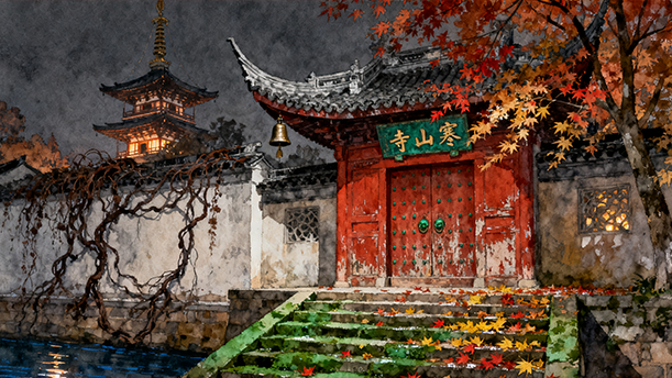 “姑苏城外寒山寺”,笔锋一转,从“眼前之景”转向“远方之地”,为“愁眠”增添了“时空的辽阔感”。“姑苏城”点明地点(今苏州),让“枫桥夜泊”有了具体的地理坐标;“城外寒山寺”则将视角拉远——诗人在江上的客船中,遥想姑苏城外的寒山寺,“寒”字既呼应前文的“霜天”(寺庙在深秋中透着寒意),也暗合“心寒”的心境(乱世漂泊,无家可依,内心如寺庙般清冷)。这一句看似在写“寺庙”,实则是诗人在“愁眠”中对“安稳”的隐约向往——寺庙是修行之所,象征着“宁静与归宿”,而自己却只能在客船中漂泊,这份“向往与现实的落差”,让愁绪更添一层。朗诵时语调可稍作平缓,“姑苏城外”读得悠远,模拟对远方寺庙的遥望;“寒山寺”的“寒”字轻读,却透着清冷,让声音中藏着“渴望归宿却不得”的怅然。