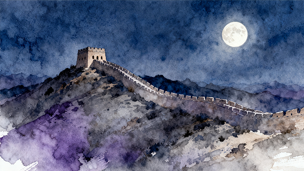 开篇“秦时明月汉时关”,以“时空交错”的笔法破题,瞬间赋予边塞“悠久厚重”的历史感,奠定全诗雄浑苍凉的基调。“秦时明月”与“汉时关”并非实指秦汉时期的明月与关隘,而是以“互文”手法,将“明月”与“关隘”的意象从秦汉延伸至盛唐——千百年来,明月始终照耀着边疆的关塞,战争也从未因朝代更迭而停歇。这一句没有写具体的战争场景,却以“秦汉”的漫长时间跨度,暗示边塞战事的连绵不绝;以“明月”的永恒与“关隘”的坚固,反衬人间的沧桑与征人的漂泊,让读者仿佛能看见千年月光下,关隘依旧、战火未熄的苍凉画面。朗诵时需读出“雄浑开阔”的气度,语调平稳舒缓,“秦时”“汉时”二字稍作强调,传递出历史的厚重感,让“明月照关”的画面既辽远又带着淡淡的苍凉,为后文的“征人未还”埋下伏笔。