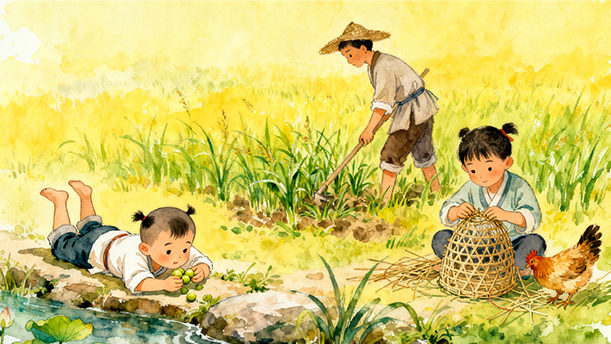 “大儿锄豆溪东,中儿正织鸡笼”写两个年长孩子的“勤”——大儿子在溪东的豆田除草,二儿子在认真编织鸡笼,“锄豆”“织鸡笼”是农村常见的劳作场景,没有刻意渲染辛苦,却透着“各司其职、勤劳持家”的踏实,两个“儿”的忙碌,既显农家孩子的懂事,更衬出家庭的和睦——父母安闲、子女勤劳,恰是田园生活的理想模样。朗诵时需保持“轻快平实”的语调,“锄豆”“织鸡笼”读得流畅,传递出“劳作中的安稳”,不疾不徐,贴合农村生活的节奏。