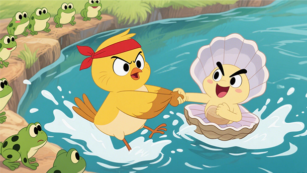 场景定格:开篇“蚌方出曝”以静态画面切入,阳光下的蚌壳成为鹬鸟的目标,瞬间打破平静。