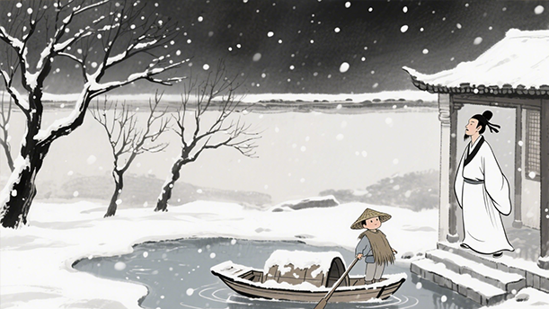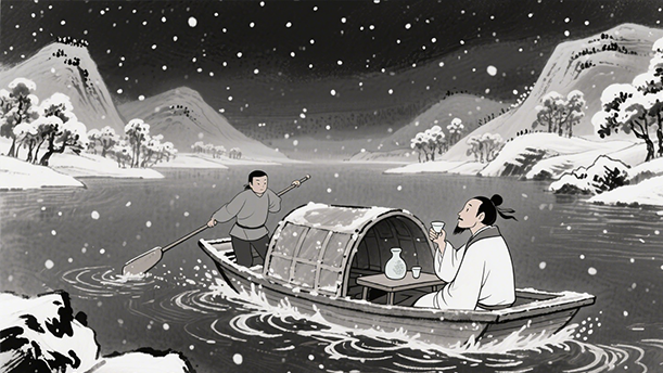 山阴雪夜,王子猷醒来见雪景皎洁,命酒吟诗,忽忆戴逵居剡县,遂连夜乘舟前往。经一夜航程至戴家门