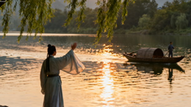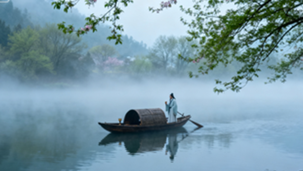 《赠汪伦》是唐代诗人李白的经典送别诗,以质朴自然的语言,将一段真挚深厚的友情描绘得动人心扉。 诗的开篇“李白乘舟将欲行,忽闻岸上踏歌声”,以简洁的叙事切入场景:诗人正欲乘舟离去,忽然听到岸上传来踏地为节、边走边唱的歌声。“将欲行”的动态与“忽闻”的意外感形成呼应,瞬间将读者带入那离别时刻的鲜活场景中,汪伦踏歌而来的画面仿佛就在眼前,为后文的情感抒发铺垫了生动的情境。 后两句“桃花潭水深千尺,不及汪伦送我情”,是全诗的神来之笔。