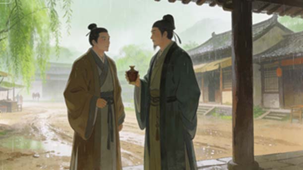 赏析:王维的《送元二使安西》,以淡笔写深情,将送别意绪融于寻常景致与动作间。开篇“渭城朝雨浥轻尘,客舍青青柳色新”,清晨的细雨沾湿了尘土,客舍旁的柳色因雨而格外清新——“浥”字柔化了离别的涩味,“柳”的意象又暗扣“留”的不舍,轻淡的春景里,已藏着隐约的惜别。