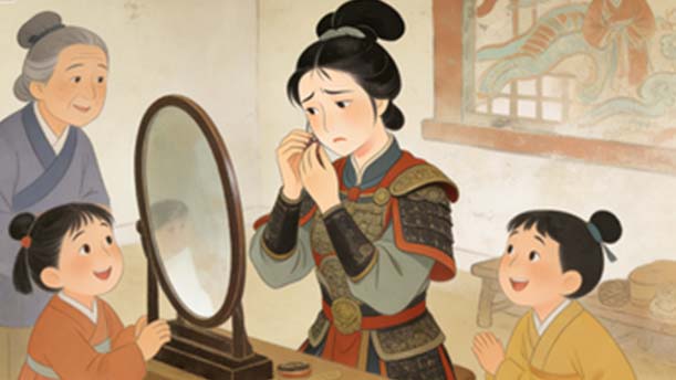 爷娘闻女来,出郭相扶将;阿姊闻妹来,当户理红妆;小弟闻来,刀霍霍向猪羊。开我东阁门,坐我西阁床。脱我战时袍,著我旧时裳。当窗理云鬓,对镜帖花黄。出门看火伴,火伴皆惊忙:同行十二年,不知木兰是女郎。