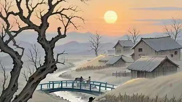 这首小令仅用二十八字,便勾勒出一幅层次分明、意境悠远的秋日黄昏图,是元散曲中写景之作的经典代表。开篇三句“孤村落日残霞,轻烟老树寒鸦”,作者一连堆砌六个具象的秋日意象,没有用一个连接词,却像电影镜头一样依次铺展开来:偏远宁静的小村落被落日的余晖晕染,天边残留着几抹粉紫的晚霞,村落里淡淡青烟缓缓升起,苍劲的老树枝桠斜伸,几只寒鸦静栖在枝头上,连鸣叫都带着秋日的清寂。这里没有刻意渲染萧瑟,却已经把秋日傍晚那种淡远又略带清冷的氛围悄悄晕染开来。