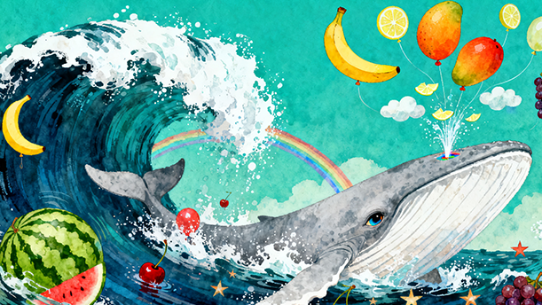 鱼儿看见了漂亮的水果气球,都朝这儿游过来,连大鲸鱼,也喷着水花游过来了呢!