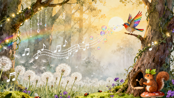 前两句带点疑惑的小好奇,“吧”字尾音微扬;“走进了”读得轻快,像脚步踩在落叶上的轻盈;“细碎的阳光”“跳跃”“飞翔”要读得灵动,“跳跃”稍快、有节奏感,“飞翔”拉长音,模拟歌声像阳光一样洒满森林的画面,传递“沉浸在歌声里”的愉悦。