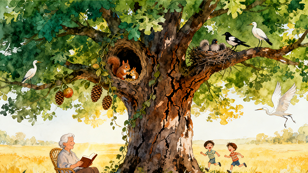 我的树叶拥抱蓝天上的白云,我的树枝抚摸成群的牛羊。也许你们认为我独自在这广阔的草原上,心中会有百年的孤寂。