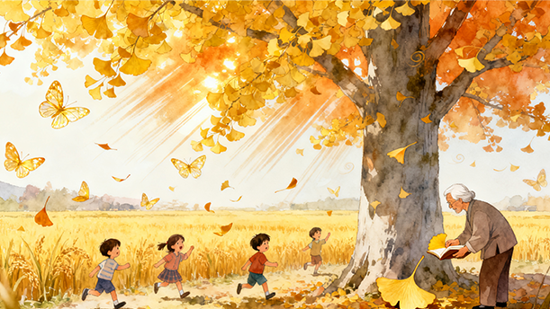 小毛虫吐出了一条细细的丝线,把叶子绕了一圈又一圈,金色的叶子渐渐变成了一个结实的茧,西风吹过树权,他牵起所有落叶的手,要带它们一起去远行。可他却小心地留下了那片裹着丝线的叶子,因为他知道,有一位“毛虫公主”正沉睡在里面——再过一百天,她就会展开金色的翅膀,和所有新长出的树叶一起,为春天翩翩起舞。