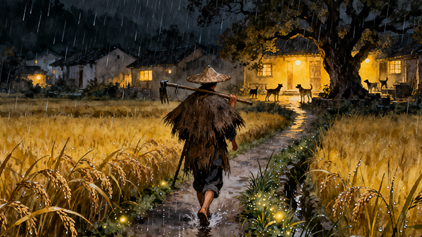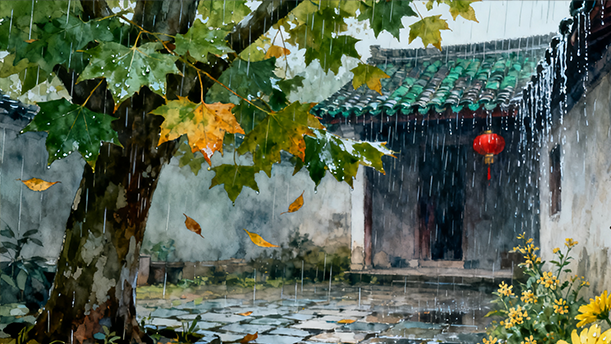 雨静悄悄地下着,只有一点细细的浙沥沥的声音。橘红色的房屋,像披着鲜艳的袈裟的老僧,垂头合目,受着雨的洗礼。那潮湿的红砖,发出有刺激性的猪血的颜色,和墙下绿油油的桂叶成为强烈的对照。灰色的癫蛤蟆,在湿烂发霉的泥地里跳跃着;在秋雨的沉闷的网底,只有它是唯一的充满愉快的生气的东西。它背上灰黄斑驳的花纹,跟沉闷的天空遥遥相应,造成和谐的色调。