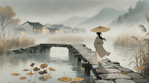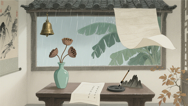 此曲描绘了一幅秋夜难眠图。开篇“风飘飘,雨潇潇”,以风雨交加之景营造出一种凄清、孤寂的氛围,奠定了全曲的情感基调。“便做陈抟也睡不着”,运用夸张的手法,借陈抟善睡之典,突出主人公心绪烦乱,即便如陈抟般善睡也难以入眠。“懊恼伤怀抱,扑簌簌泪点抛”,直接抒发主人公内心的懊恼与哀伤,泪水不由自主地簌簌落下。“秋蝉儿噪罢寒蛩儿叫”,通过描写秋蝉的聒噪和寒蛩的鸣叫,进一步渲染出秋夜的凄凉与寂静,同时也衬托出主人公内心的烦躁与不安。“淅零零细雨打芭蕉”,以细雨打芭蕉的声音收尾,那淅淅沥沥的雨声,仿佛敲打在主人公的心上,更增添了一份愁绪与哀伤。整首曲子情景交融,将主人公在秋夜的孤独、懊恼与哀伤之情表现得淋漓尽致。