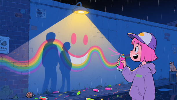 在钢筋水泥构筑的都市丛林中,“墙”成为现代人孤独的象征。张晓楠以“微笑”为媒介,将冰冷的墙转化为花与云,既是对工业文明异化的批判,也提供了一种东方化的解决方案——通过内在观照重构世界,与海涅“世界美丽”的信念形成跨文化共鸣。