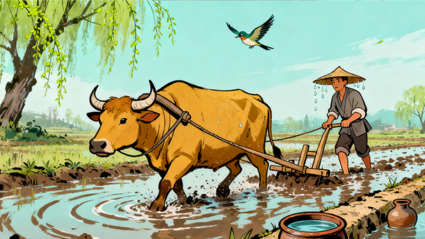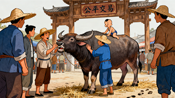 “比方说,我们看见这根木头桩子,牛眼睛看来就像一根撑天柱。比方说,一块田十多亩,牛眼睛看来就没有边,没有沿。牛眼睛看出来的东西,都比原来大,大许多许多。看我们人,就有四金刚那么高,那么大。站到我们跟前它就害怕了,它不敢倔强,随便拿它怎么样都不敢倔强。它当我们只要两个指头就能捻死它,抬一抬脚趾拇就能踢它到半天云里,我们哈气就像下雨一样。那它就只有听我们使唤,天好,落雨,生田,熟田,我们要耕,它就只有耕,没得话说的。你先生说对不对,幸好牛有那么一双眼睛。不然的话,还让你使唤啊,那么大的一个力气又蛮,踩到一脚就要痛上好几天。对了,我们跟牛,五个抵一个都抵不住。好在牛眼睛看出来,我们一个抵它十几个。”
