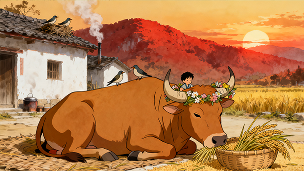 在乡下住的几年里,天天看见牛。可是直到现在还像显现在眼前的,只有牛的大眼睛。冬天,牛拴在门口晒太阳。它躺着,嘴不停的磋磨,眼睛就似乎比忙的时候睁得更大。牛眼睛好像白的成分多,那是惨白。我说它惨白,也许为了上面网着一条条血丝。我以为这两种颜色配合在一起,只能用死者的寂静配合着吊丧者的哭声那样的情景来相摹拟。牛的眼睛太大,又鼓得太高,简直到了使你害怕的程度。我进院子的时候经过牛身旁,总注意到牛鼓着的两只大眼睛在瞪着我。我禁不住想,它这样瞪着,瞪着,会猛的站起身朝我撞过来。我确实感到那眼光里含着恨。我也体会出它为什么这样瞪着我,总距离它远远的绕过去。有时候我留心看它将会有什么举动,可是只见它呆呆地瞪着,我觉得那眼睛里似乎还有别的使人看了不自在的意味。