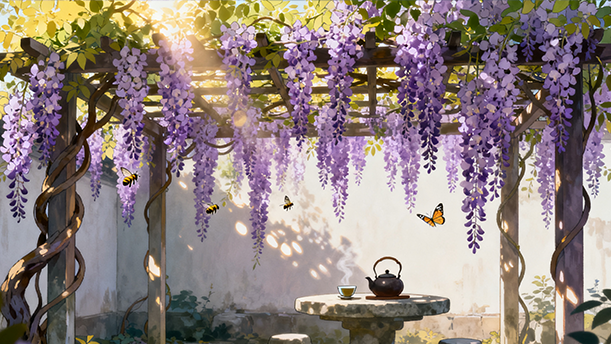 这里春红已谢,没有赏花的人群,也没有蜂围蝶阵。有的就是这一树闪光的、盛开的藤萝。花朵儿一串挨着一串,一朵接着一朵,彼此推着挤着,好不活泼热闹!