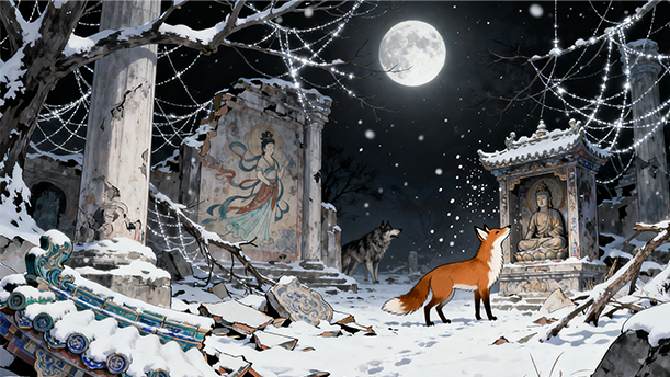 废墟吞没了我的企盼,我的记忆。片片瓦砾散落在荒草之间,断残的石柱在夕阳下站立,书中的记载,童年的幻想,全在废墟中陨灭。昔日的光荣成了嘲弄,创业的祖辈在寒风中声声咆哮。夜临了,什么没有见过的明月苦笑一下,躲进云层,投给废墟一片阴影。
