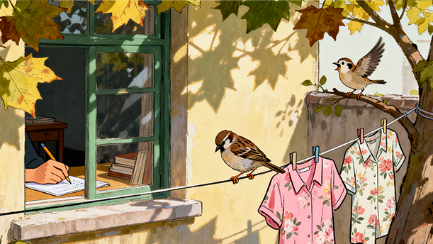 它是点缀在人类生活过程当中的活标点;落在冬季枯枝上时,是逗号;落在某一个墙头上时,是句号;好几只一起落在电线上时,是省略号……求偶的一对儿追逐翻飞,累了落在上下枝时,就是分号。