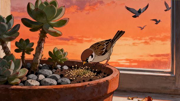它那么小,落在枝上就是近视眼中的一个黑点,连逗号还是句号都看不清楚。低飞、跳跃、啄食、梳理羽毛,发出永远幼稚的鸣叫,在季节的变化中坚忍或欢快,追逐着交配,有责任感地孵蛋和育雏……活着。