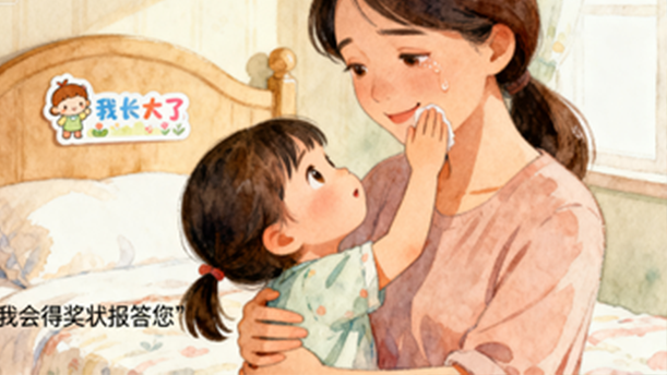 鉴赏:《妈妈的泪花》是一首充满童真与温情的儿童诗,将孩子成长的宣告与母子间的情感羁绊描摹得细腻动人。 诗歌以孩子的视角展开,开篇便用充满稚气的宣告“请不要再叫我小娃娃……从今天起,我要和它们分家”,鲜活地展现出孩子渴望长大的心理,那些亲昵的称呼在孩子眼中成了“成长”的羁绊,充满童真的倔强。接着,孩子对“空空的小书包”充满期待,坚信“明天,书呀、本呀,老师一定会发”,将即将入学的憧憬与天真的笃定融合,把孩子对新身份的向往刻画得真切可感。而后,孩子许下“每年用一张‘好学生’奖状作为报答”的承诺,稚嫩的话语里满是对成长的自信与对妈妈的感恩,让这份成长的宣告更具温度。