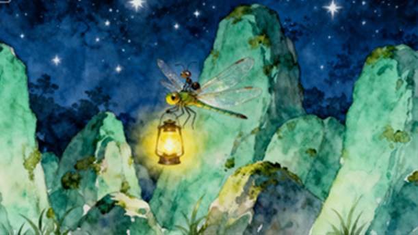小蚂蚁爬上“飞机”,蜻蜓起飞了。萤火虫在前面点起了亮晶晶的小灯笼。