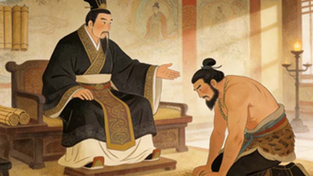 蔺相如心平气和地问他们:“廉将军跟秦王相比,哪一个厉害呢?”大伙儿说:“那当然是秦王厉害。”蔺相如说:“对呀!我见了秦王都不怕,难道还怕廉将军吗?要知道,秦国现在不敢来打赵国,就是因为国内文官武将一条心。我们两人好比是两只老虎两只老虎要是打起架来,不免有一只要受伤,甚至死掉,这就给秦国造成了进攻赵国的好机会。你们想想,国家的事儿要紧,还是私人的面子要紧?”相如手下的人听了这一番话,非常感动,以后看见廉颇手下的人,都小心谨慎,总是让着他们。相如的这番话,后来传到了廉颇的耳朵里。廉颇惭愧极了。他脱掉一只袖子,露着肩膀,背了一根荆条,直奔蔺相如家。蔺相如连忙出来迎接廉颇。