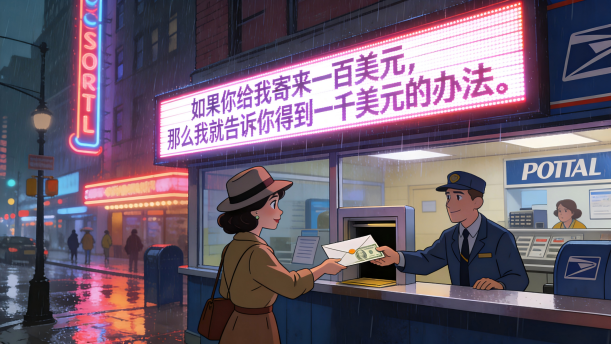 在美国某城市的大街上贴着一张广告:“ 如果你给我寄来一百美元 ,那么我就告 诉你得到一千美元的办法 。 ”